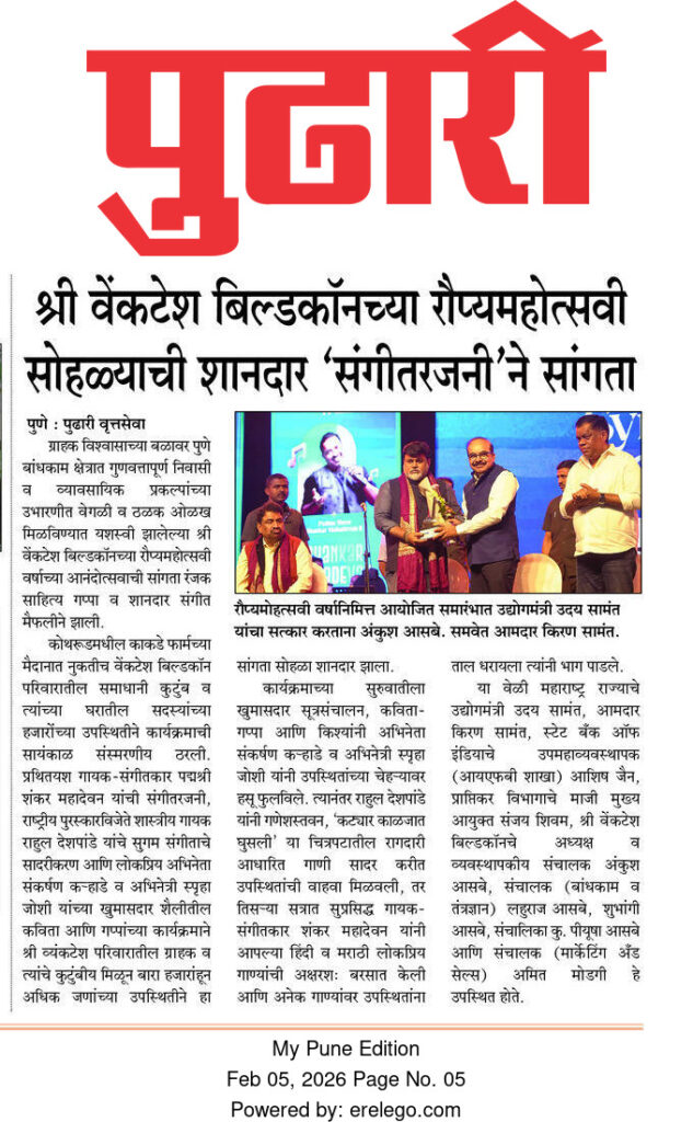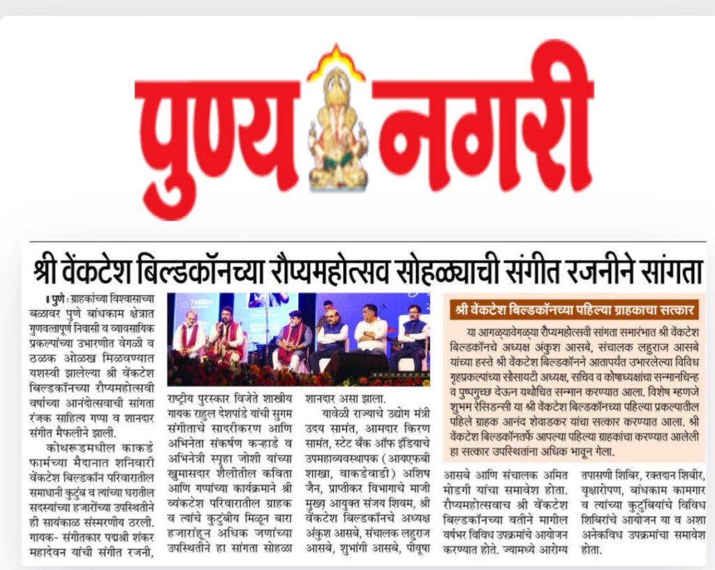 Launching Event of Venkatesh Erandwane Central – VEC The most awaited launch of our new project Venkatesh Erandwane Central, was graced by dignitaries from various fields. The grand event received press coverage with much praise from different newspaper. Here are a few clippings of the coverage. It was a grand event to witness.